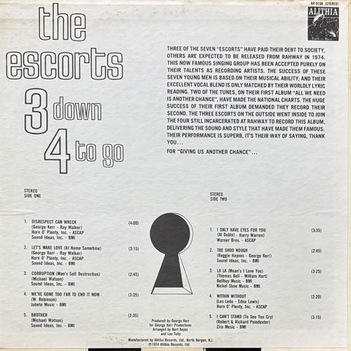 GEORGE KERRに見出された囚人コーラスグループESCORTSの2NDアルバム。J. DILLA“Don't Cry”、BIG SHUG“Lonely Heart”ネタに使われた“I CAN'T STAND (TO SEE YOU CRY)”、METHOD MAN, GHOSTFACE KILLAH & RAEKWON featuring INSPECTAH DECK & SUN GOD“Gunshowers”ネタに使われたDELFONICSの名曲カヴァー“LA LA (MEAN'S I LOVE YOU)”や“LET'S MAKE LOVE (AT HOME SOMETIME)”“WE'VE GONE TOO FAR TO END IT NOW”といった前作の流れを汲むスウィートナンバー他、終盤のグルーヴもカッコよい“BROTHER”や“DISRESPECT CAN WRECK”“CORRUPTION (MAN'S SELF DESTRUCTION)”などの前作ではあまり聴かれなかった黒くファンキーな楽曲も素晴らしい名作です!