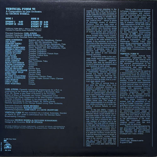50年代から活動する米ピアニスト/コンポーザーGEORGE RUSSELLがSWEDISH RADIO JAZZ ORCHESTRAと共演した77年のライブ録音作品。アブストラクトなベースをフィーチャーしたドープ・ジャズファンク“EVENT IV”、HERBIE HANCOCK「Death Wish」を彷彿させる“EVENT II”など、5部で構成されたサントラ作品かの様なコンセプトアルバム!サンプリングにオススメ!