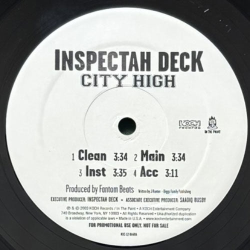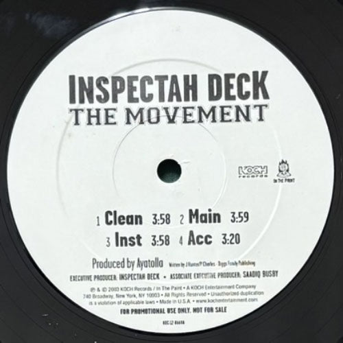 WU-TANG一派のいぶし銀INSPECTAH DECKの2NDアルバム「The Movement」からのプロモオンリーシングル。AYATOLLAHプロデュース、MELBA MOORE“Play Boy Scout”使いの“THE MOVEMENT”、PHANTOM BEATSプロデュース、SOUL SURVIVORS“City of Brotherly Love”使いの“CITY HIGH”、両面ドープ!