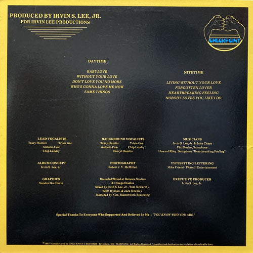 元SPECIAL DELIVERYのIRVIN LEE率いるグループIRVIN LEE PROJECT唯一のアルバム。アーバンなミッドナンバー“BABYLOVE”“WITHOUT YOUR LOVE”といったリズムナンバーの「DAYTIME」サイド、“LIVING WITHOUT YOUR LOVE”“NOBODY LOVES YOU LIKE I DO”といったメロウバラッドの「NITETIME」の2部構成による、インディー・モダンソウル好作!