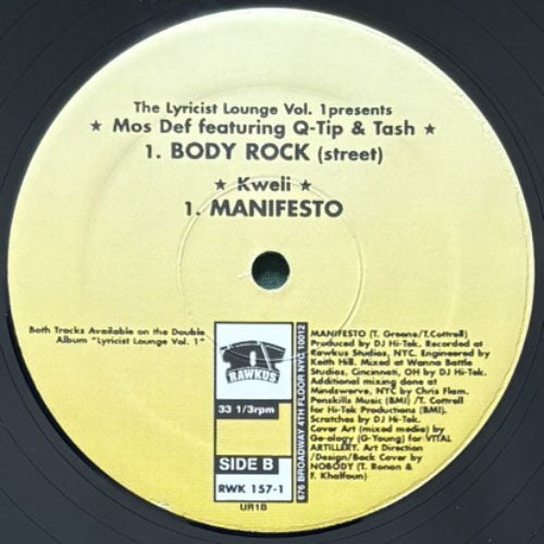当時のアングラシーンを切り取ったコンピレーション「Lyricist Lounge Volume One」からのシングルカット。MOS DEF、Q-TIP、TASHによる“BODY ROCK”はリリース当時はメンツの割に地味と評価は分かれましたが、SHAWN J. PERIODのビートは中毒性が高く、今となっては立派なクラシックです!HI-TEKプロデュースによるTALIB KWELI“MANIFESTO”も最高!