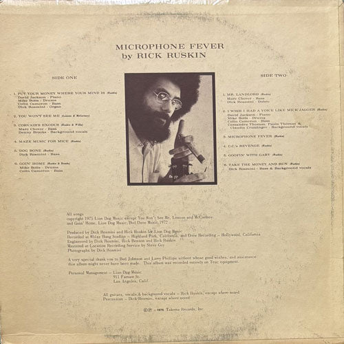 デトロイト生まれのシンガーソングライターRICK RUSKINが、JOHN FAHEYのレーベル「TAKOMA」からリリースした2NDアルバム。味わい深いアコースティック・ソングが並ぶ名作!ファンキーな“PUT YOUR MONEY WHERE YOUR MIND IS”のイントロにドラムブレイク!