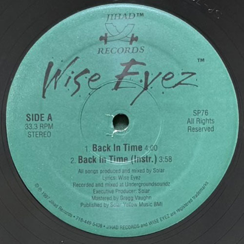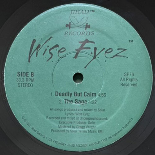 カタログ数は少数ながらいずれもアングラヘッズに人気の高い「JIHAD」レーベルから、後年GURUとの関係が物議を醸すSOLARがプロデュースしたラッパーWISE EYEZ唯一のシングル。BOB JAMES“Storm King”使いの“BACK IN TIME”、 ANIMALS“House of the Rising Sun”使いの“DEADLY BUT CALM”、アングラ臭プンプンの“THE SAGA”、いずれもドープ!